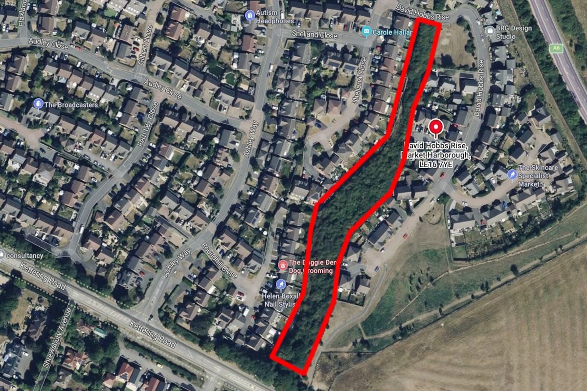 SUPERB WOODLAND INVESTMENT for Sale south of David Hobbs Drive, Market Harborough. Approx 1.43 acres of mostly wooded land overlooking the town. The site may be suitable for multiple uses (subject to consents)